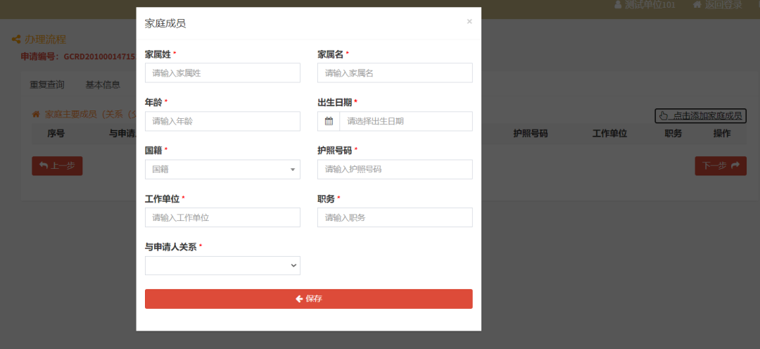 9.“家庭主要成员”页面,点击“添加家庭成员”按钮弹出表单填写,其中标记“*”的为必填项,请不要置空,填写完毕点击“保存”按钮进行保存。点击“下一步”进入最后一个tab页。