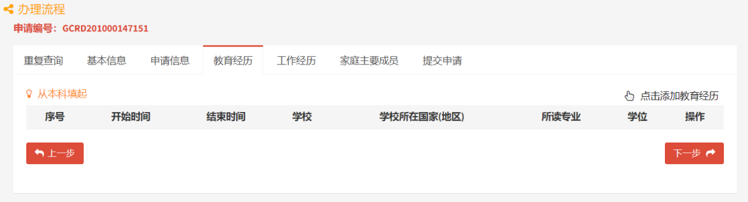 7.“教育经历”页面,请从本科填起,点击“点击添加教育经历”按钮,弹出教育经历填写表单,表单内标记“*”的为必填项,请不要不填,填写完毕请点击“保存”按钮进行保存,教育经历填写完毕后请点击“下一步”按钮进入下一个tab页面。