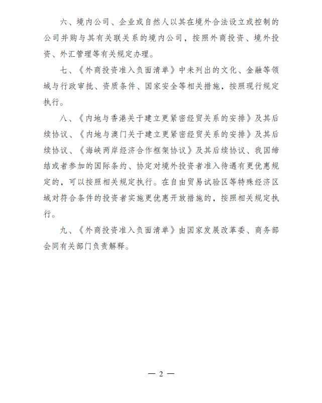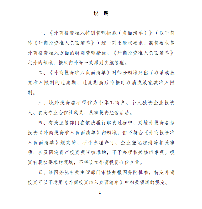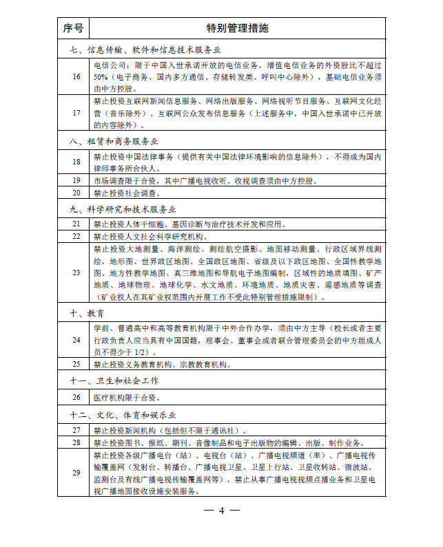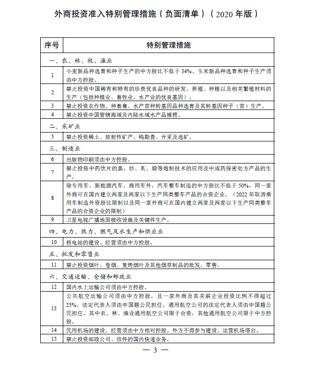 外商投资准入特别管理措施 (负面清单)(2020 年版)