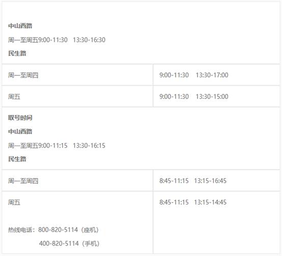 取号时间 中山西路 周一至周五9:00-11:15 13:30-16:15 民生路 |