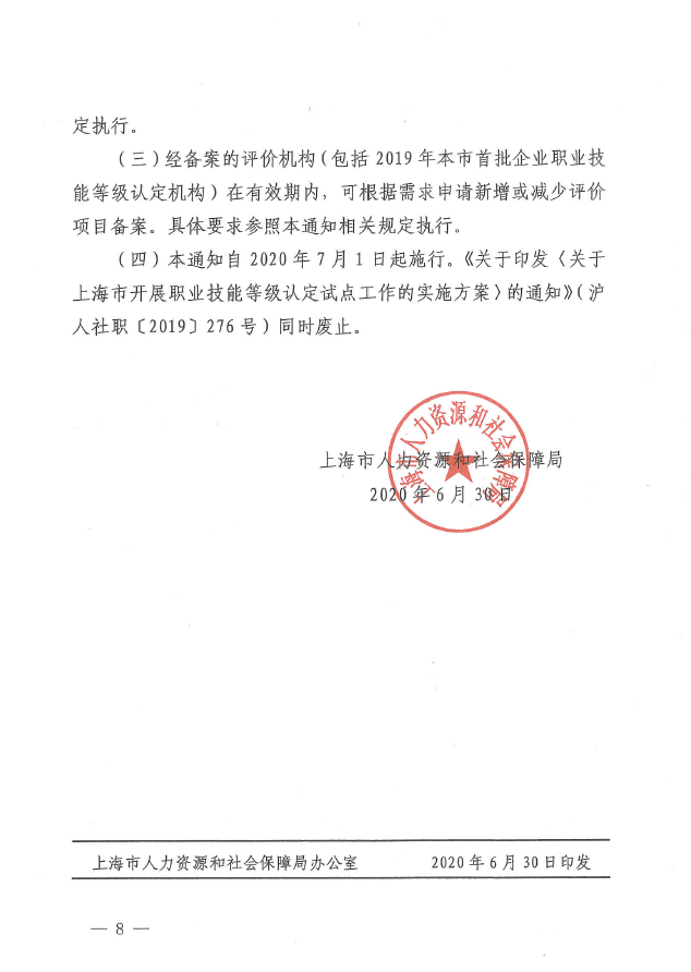 上海市人力资源和社会保障局关于全面推行企业职业技能等级认定工作的通知(沪人社职【2020】240号)