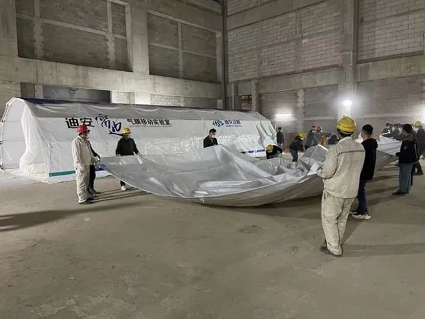 同一天,一批批气膜舱装配物资也顺利进场,工程建设人员在技术人员指导下,搬运设备、连接负压管道、检验气密性。
