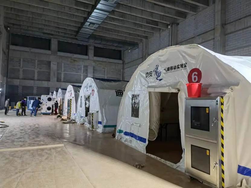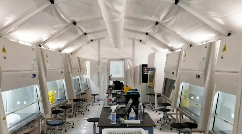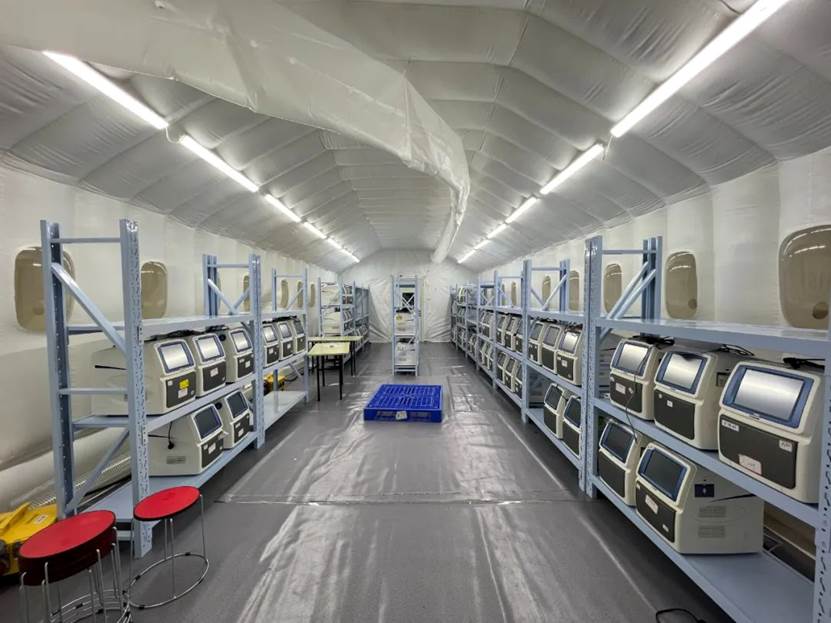 据了解,这组气膜实验室由封闭式的帐篷组装而成,包括试剂制备区、核酸提取区和扩增分析区等作业空间,能实现核酸快速检验,每天最多能完成10万管、100万人份的核酸检测任务。