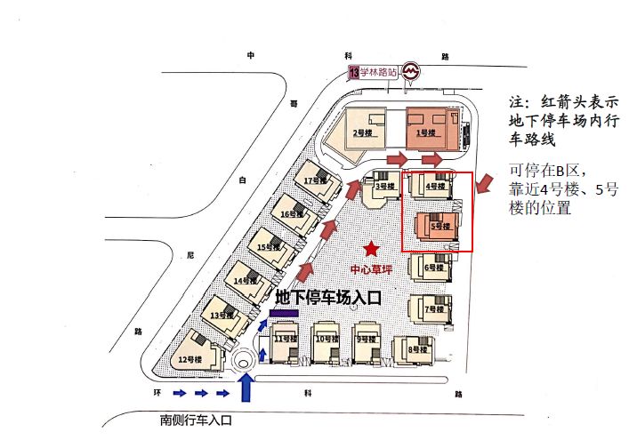 【温馨提示】建议乘坐公共交通绿色出行(地铁13号线学林路3号口),园区内地下停车库指引图如下↓
