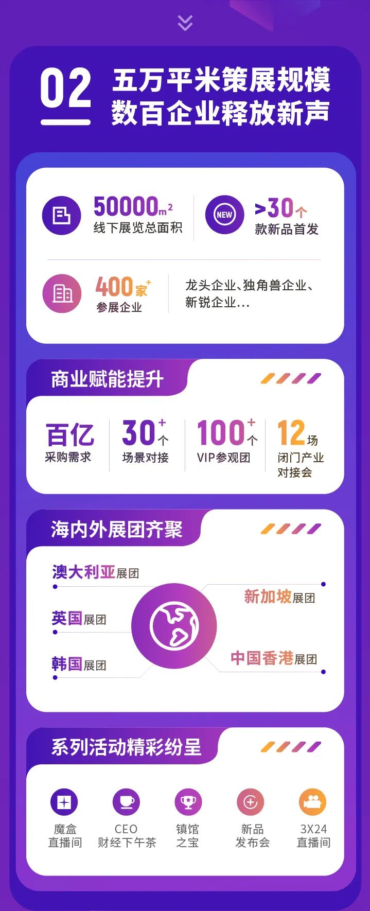 在商业赋能方面,今年大会深度融合企业、媒体、IP资源,联动澳洲、英国、韩国等组建100余个VIP参观团,并打造20场闭门产业对接会和30+场景发布活动,现场将发布百亿采购需求,为展商提供精准对接的商贸合作平台。大会通过打造“魔盒直播间”“CEO财经下午茶”“镇馆之宝”“3*24直播间”等配套活动,进一步激活大会资源,促进行业“共创、共建、共融、共治、共享、共赢”。