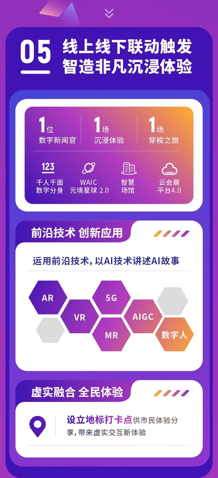如何让全民共享科技盛宴?本届WAIC将持续深化AI技术,拓展智能化应用场景,联动张江、徐汇、闵行三地会场,充分融合AR、VR、MR、5G、AIGC及数字人等一系列前沿技术,打造一位数字新闻官、一场沉浸体验、一场时空穿梭之旅,以及千人千面数字分身、WAIC 元境星球2.0、智慧场馆、云会展平台4.0等数字应用;开放线下地标打卡点,供游客市民体验分享,在数字与现实世界实现身临其境般的极致体验。