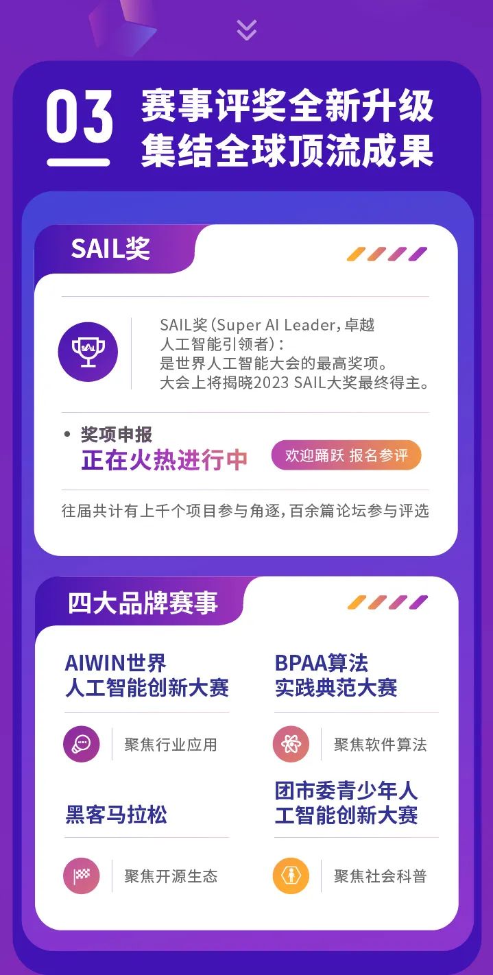 人工智能产业实践离不开人才的支撑,WAIC一直致力于为AI发展的中坚力量构建交流平台。今年大会聚焦战略人才、领军人才、青年人才等多层次人才梯队,策划人工智能青年先锋论坛、开源集市、书友会、人才招聘会等人才活动。同时以“SAIL奖”为引领,通过AIWIN世界人工智能创新大赛、BPAA算法实践典范大赛、黑客马拉松、团市委青少年人工智能创新大赛等品牌赛事活动,进一步汇聚国内外优秀青年学者以及领军人才和团队,打造高品质的人才生态。