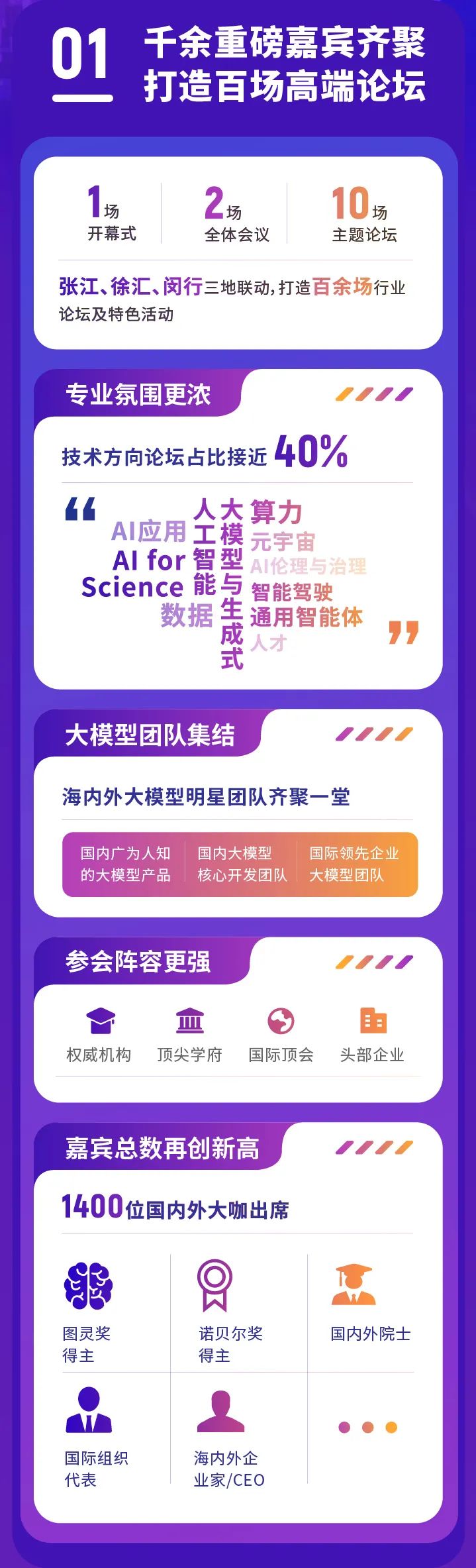 据了解,今年大会重磅回归线下,嘉宾总数将再创新高。预计将有超1400位国内外大咖出席,包括图灵奖得主、诺贝尔奖得主、国际组织代表、国外院士、海内外企业家/CEO等。会上将重点围绕大模型、AI for Science、通用智能体、算力、元宇宙、人才等十大话题展开讨论,上演精彩头脑风暴。