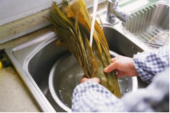 1.干粽叶用清水浸泡,新鲜粽叶省略此步。将浸泡好的粽叶捞出,剪掉叶柄,再用清水冲洗,沥干备用。