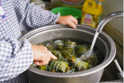 7.锅中倒入冷水,将包好的粽子放入锅中,大火烧开后小火慢炖1个小时左右,散发着浓郁肉香、粽叶香的鲜肉粽就做好啦。