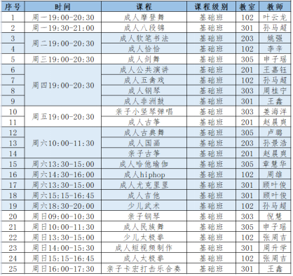 本期文化艺术课程分为基础班和提高班两个板块。新增许多精彩课程,包括成人五禽戏、成人古筝、成人hiphop、亲子小竖琴、太极拳等29项艺术课程。