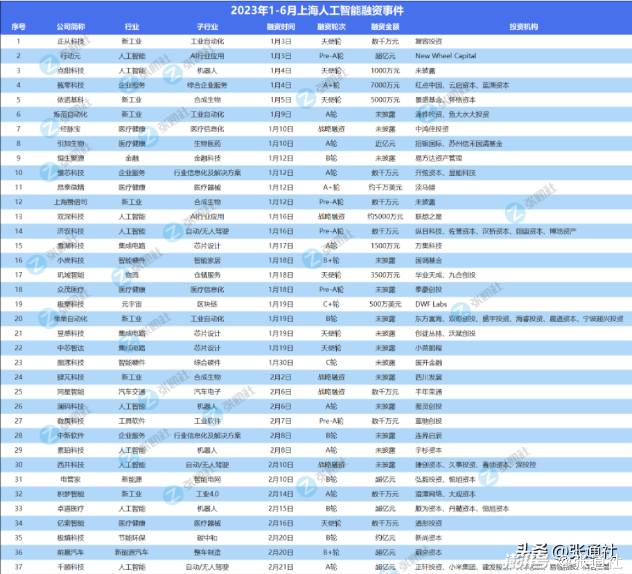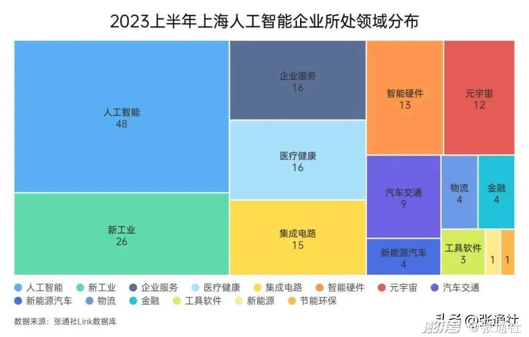 上海已经将人工智能看作重点发力的先导产业,这让上海人工智能产业得到迅速发展。根据张通社Link数据库,2023上半年,上海一共发生了172起AI融资事件,涉及智能汽车、新工业、医疗健康、集成电路、元宇宙等14个领域。除去未透露金额的事件,融资总金额已经达到95.24亿元。
