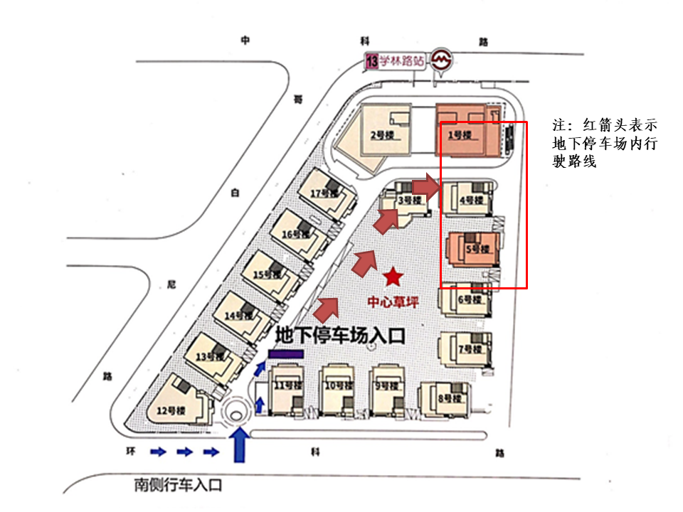 2、如您驾车出行,请从环科路南门进入至地下停车场,停至4、5号楼附近车位即可。