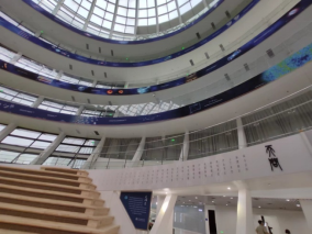 来到位于张江科学城的李政道研究所,只见一个球形空间连接着两栋实验楼。步入一楼大厅,这个有着巨型玻璃穹顶的球形空间敞亮空旷,身处其中忍不住要抬头“仰望星空”。玻璃穹顶下,层层环形木制阶梯座椅,为科研工作者营造自由交流的场所,是名副其实的“会客厅”。阶梯外侧,正是长达600米的“天问”长卷。