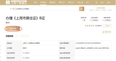 登录“一网通办”总门户的“办理《上海市居住证》B证页面”,点击“立即办理”进入。
