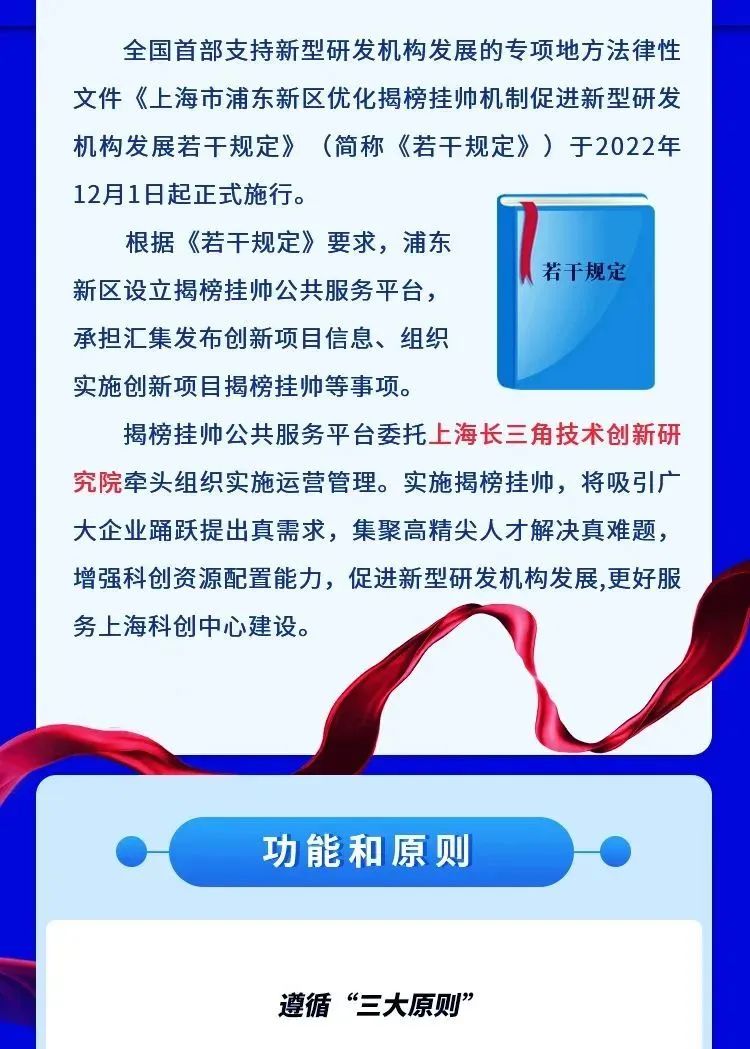 2023年1月4日,浦东新区揭榜挂帅公共服务平台正式揭牌。该平台由上海市浦东新区科技和经济委员会建立,目前委托上海长三角技术创新研究院(“上海长三院”)牵头组织实施。