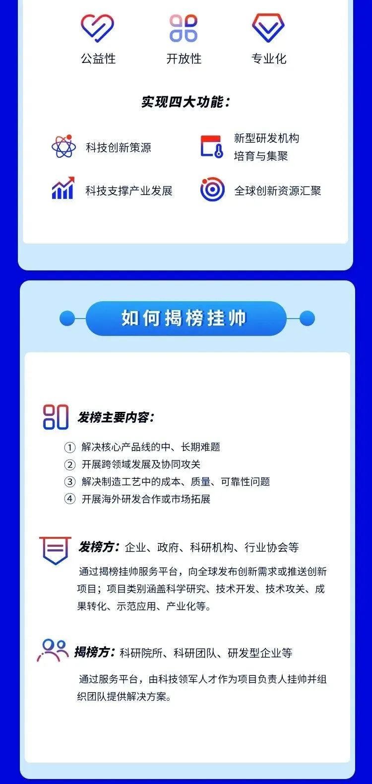 揭榜挂帅,是一种科技悬赏机制,针对政府关注重点科技问题、企业关注关键技术问题、研究机构重大科技成果转化问题,面向全社会开放征集科技创新成果或技术解决方案,以开放创新的形式最大程度地调动社会各界创新资源潜能,高效快速找到切实可行的解决方案。