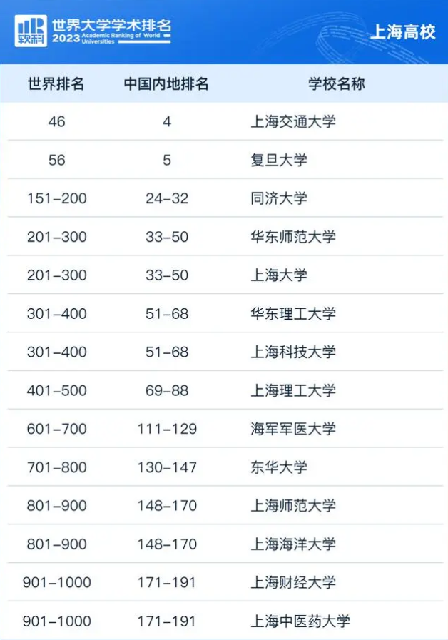 上海共有14所高校上榜,上榜高校数位居全国第4。其中,上海交通大学和复旦大学稳居全球百强。还有6所高校入围世界500强,分别是同济大学(151-200)、华东师范大学(201-300)、华东理工大学(201-300)、上海大学(201-300)、上海科技大学(301-400)和上海理工大学(401-500)。