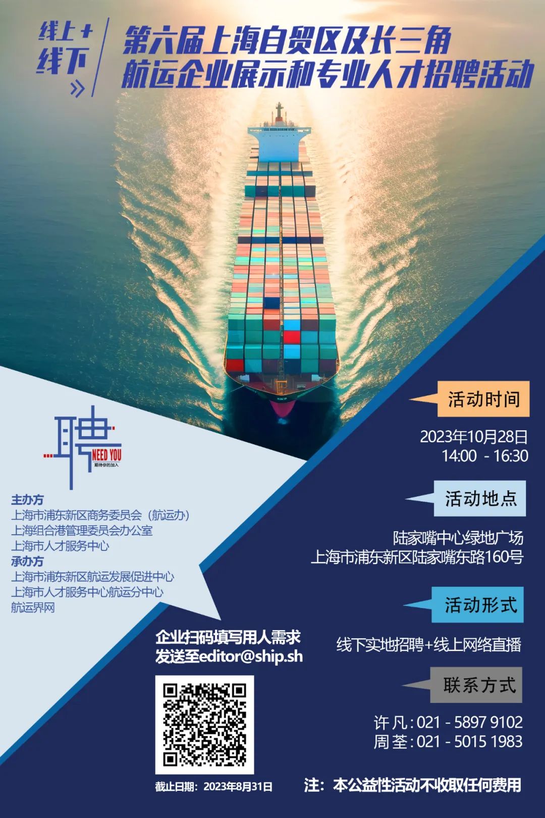 为此,由上海市浦东新区商务委(航运办)、上海组合港管委会办公室、上海市人才服务中心共同主办,上海市浦东新区航运发展促进中心、上海市人才服务中心航运分中心、航运界网联合承办的“2023第六届上海自贸试验区及长三角航运企业展示和专业人才招聘活动”,拟于2023年10月28日(周六)在上海市浦东新区陆家嘴中心绿地广场举行,以期助力浦东打造引才聚才的“强磁场”,为浦东经济高质量发展注入动力,努力建设成为新时代中国改革开放人才新高地。