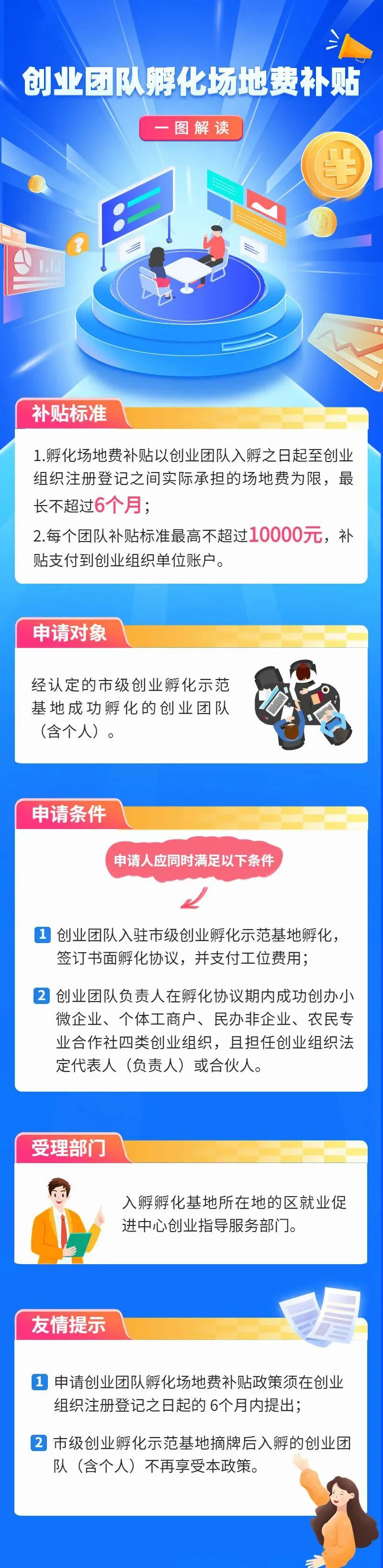 补贴标准以创业团队入孵之日起到创业组织注册登记之间实际承担的孵化场地费为限。每个团队补贴标准最高不超过10000元,补贴支付到创业组织单位账户。
