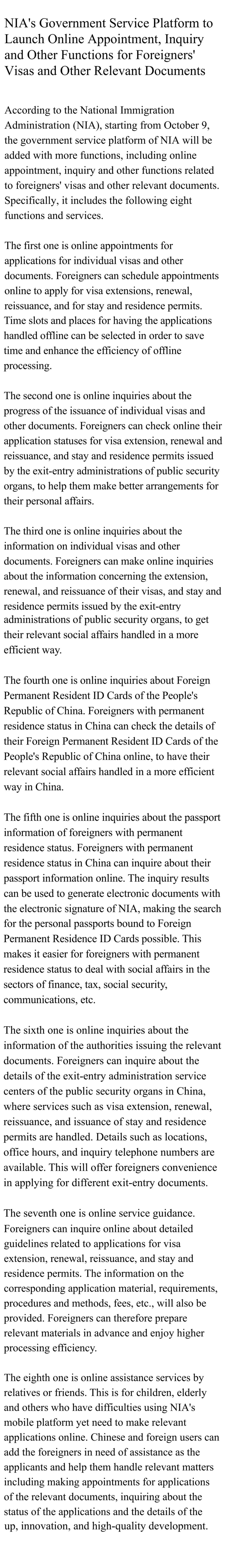 10月9日起,国家移民管理局政务服务平台将开通在华外籍人士签证证件网上预约查询等功能。具体包括8项内容: