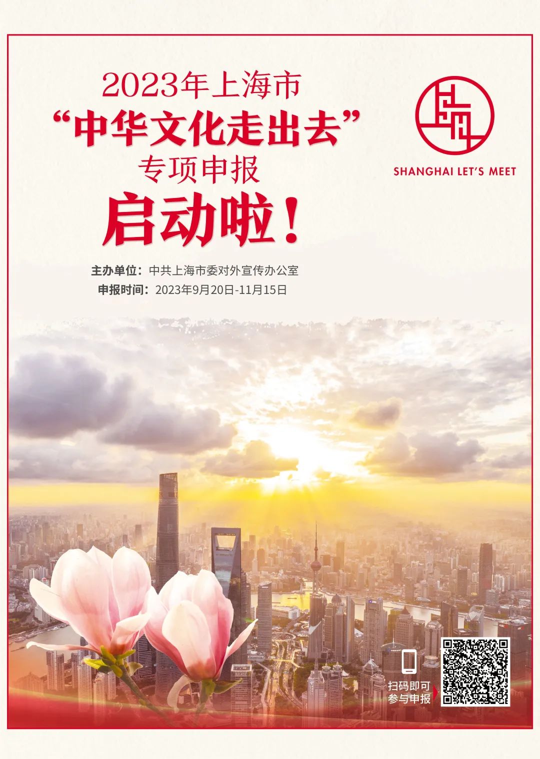 2023年9月20日-11月15日,上海市“中华文化走出去”专项申报(以下简称“专项申报”),面向全市启动。今年将重点鼓励与支持中华文化优秀作品国际推广、重点鼓励与支持在海外举办国际文化交流,鼓励与支持对外讲好中国故事、展现上海城市形象的创新表达、国际传播和文明对话,进一步助力打造文化传承与创新发展的上海样本,助力建设具有世界影响力的社会主义现代化国际大都市,推动中华文化更好走进世界,推动国际社会感知中国、感知上海。