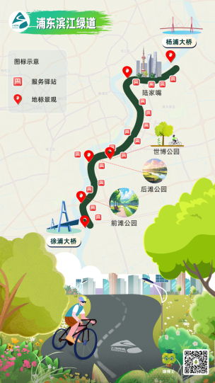 24公里岸线“漫步道、跑步道、骑行道”三道贯通,从杨浦大桥起,途经陆家嘴、南浦大桥、世博公园、卢浦大桥、后滩公园、前滩公园、徐浦大桥,直至闵行区界。