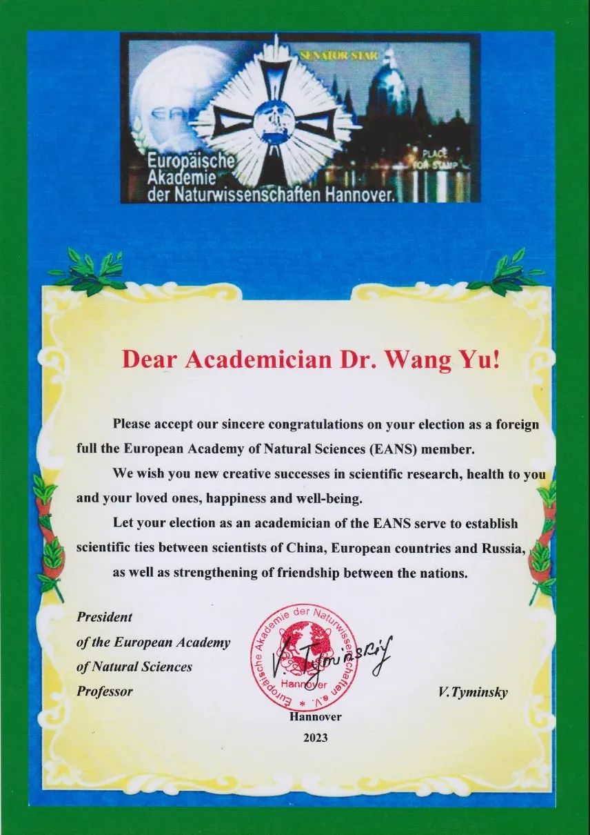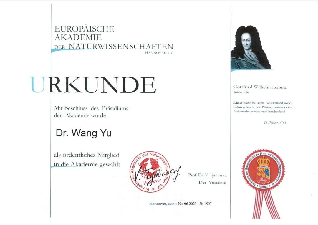 近日,欧洲自然科学院院长弗拉基米尔·蒂明斯基(Vladimir Tyminskiy)发来贺信,宇昂科技创始人兼首席科学家王宇博士因在水溶性高分子研究领域的特殊贡献,当选为2023年度欧洲自然科学院外籍院士。