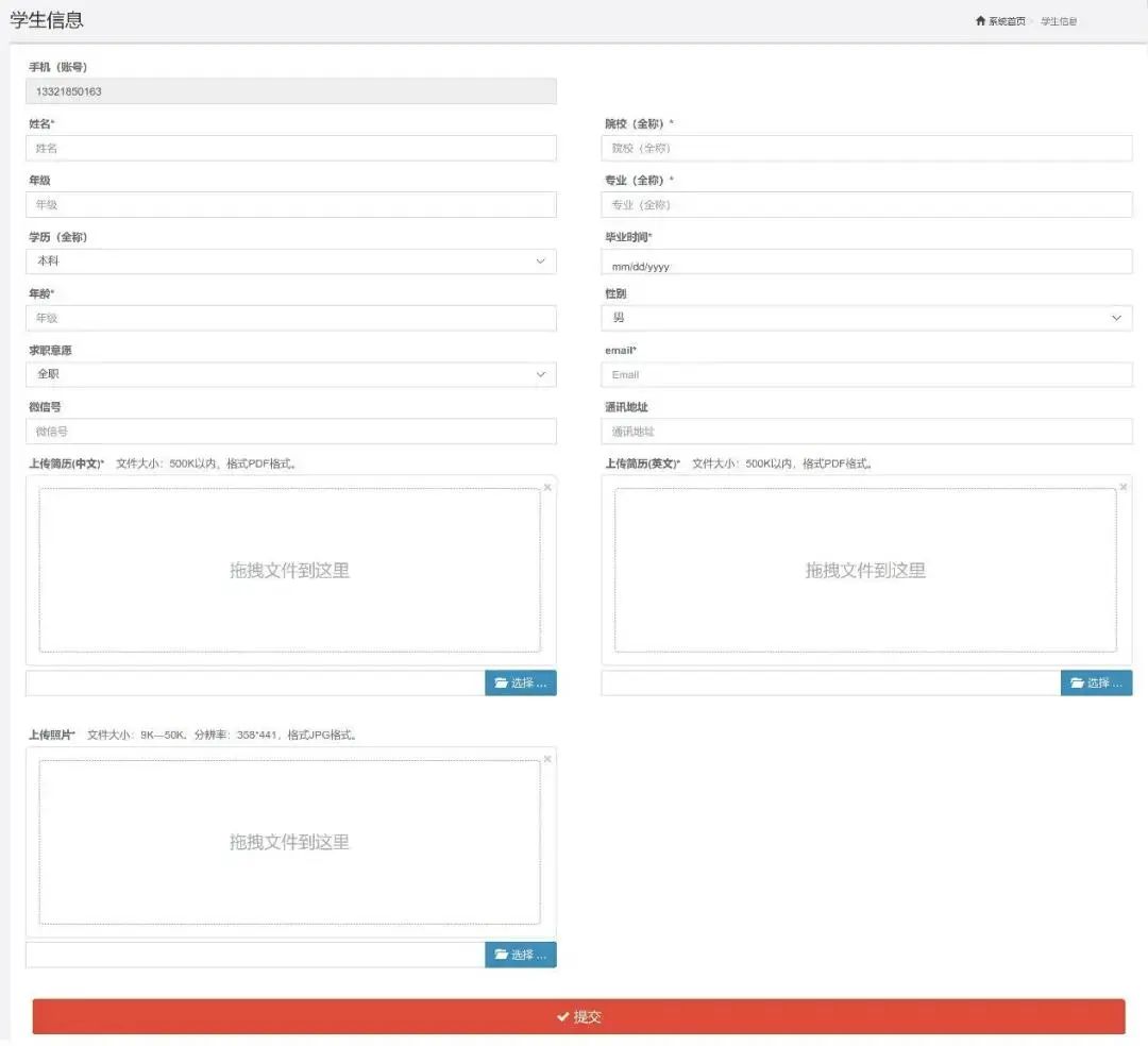 4、注册成功后,需要先填写学生信息、上传中英文简历和个人标准照,提交后自动开通在线应聘功能。学生基本信息会提供给招聘企业,请仔细、慎重、如实填写信息,提交后不能修改!