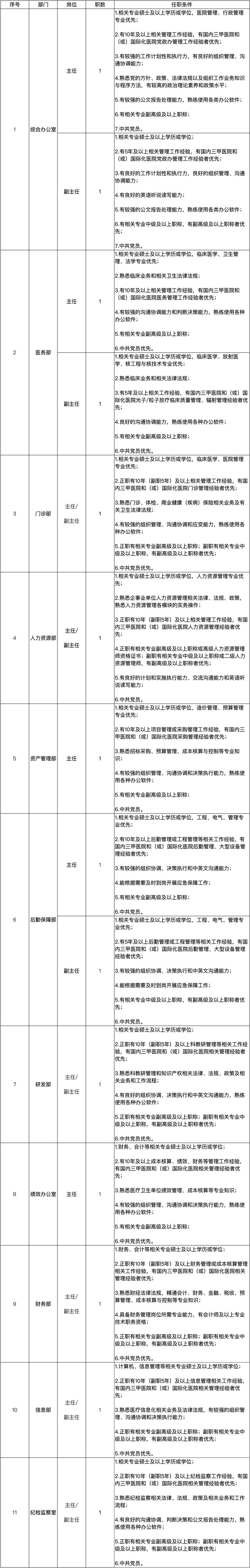 因医院建设发展和运营管理需要,为进一步提升医院管理科学化、专业化、精细化水平,按照公开、平等、竞争、择优的原则,现面向社会公开招聘以下工作人员。
