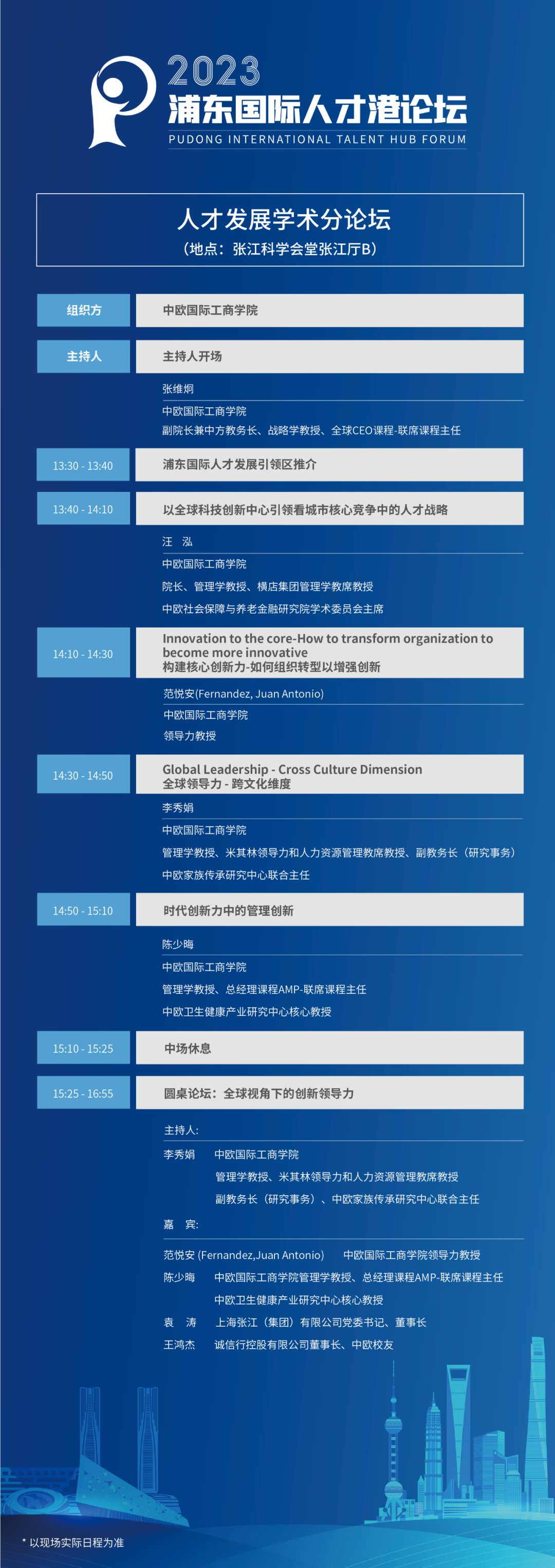 “2023浦东国际人才港论坛”将于12月6日开幕。本次论坛由中共上海市委人才工作领导小组办公室、上海市浦东新区人民政府指导,中共上海市浦东新区委员会组织部、上海市浦东新区人力资源和社会保障局、中欧国际工商学院、上海张江(集团)有限公司、上海浦东投资控股(集团)有限公司、上海交通大学生命科学技术学院主办,上海浦东人才发展有限公司承办,光辉国际联合承办。