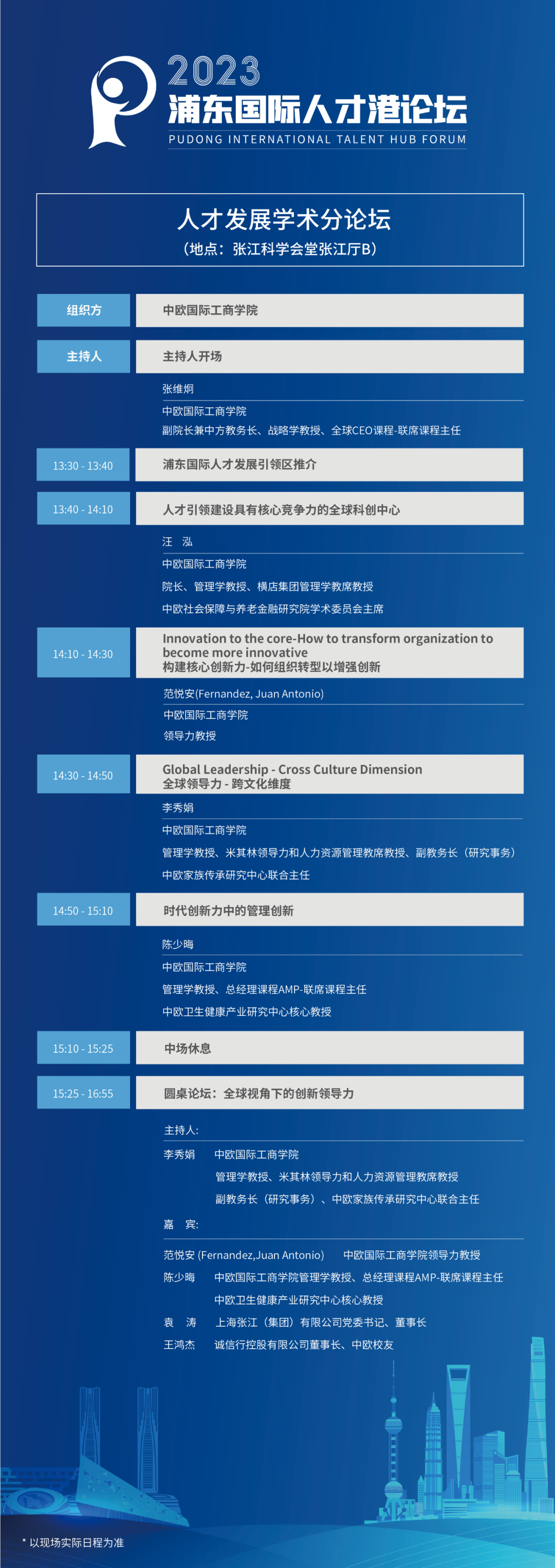 “2023浦东国际人才港论坛”将于12月6日开幕。本次论坛由中共上海市委人才工作领导小组办公室、上海市浦东新区人民政府指导,中共上海市浦东新区委员会组织部、上海市浦东新区人力资源和社会保障局、中欧国际工商学院、上海张江(集团)有限公司、上海浦东投资控股(集团)有限公司、上海交通大学生命科学技术学院主办,上海浦东人才发展有限公司承办,光辉国际联合承办。