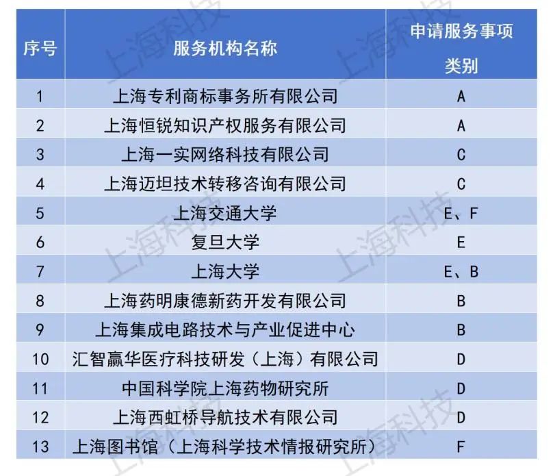 为进一步发挥上海市科技创新券的作用,激励服务机构增强服务能力和水平,为中小企业和创新创业团队营造更加良好的创新创业氛围,按照《关于组织开展2023年度上海市科技创新券“白名单”服务机构评定工作的通知》要求,现将2023年度上海市科技创新券“白名单”服务机构予以公布,共13家服务机构入选,覆盖6大类服务事项类别。