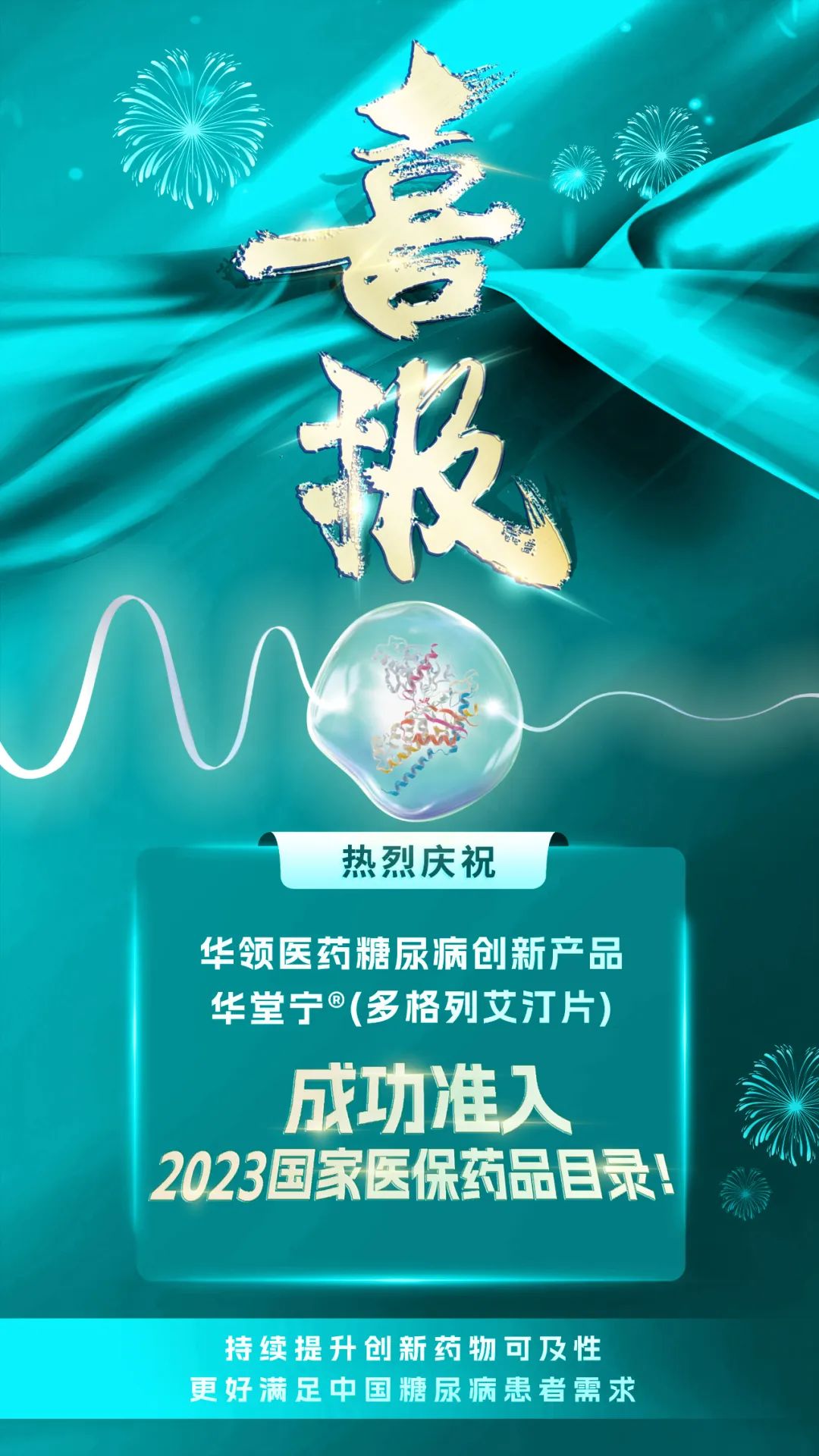 华领医药(“公司”,香港联交所股份代号:2552.HK)近日宣布,公司自主研发的糖尿病全球首创新药葡萄糖激酶激活剂(GKA)多格列艾汀(商品名:华堂宁®)成功纳入国家医疗保障局(“国家医保局”)发布的《国家基本医疗保险、工伤保险和生育保险药品目录》(“国家医保药品目录”)。多格列艾汀是华领医药首次参加医保谈判的首款商业化产品。此次顺利进入医保,标志着华领医药在商业化道路上的又一次重大突破。最新的国家医保药品目录将于2024年1月1日执行。
