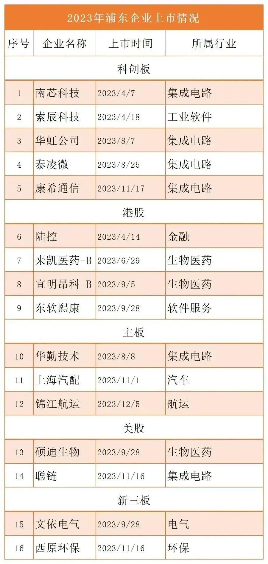 2023年,浦东企业在资本市场上百花齐放。新增的16家上市企业中,有5家在科创板上市,4家在港股上市,3家在主板上市,美股和新三板各有2家。科创板上市企业占浦东新增上市企业的三分之一,体现了浦东硬核科技的鲜明特质。