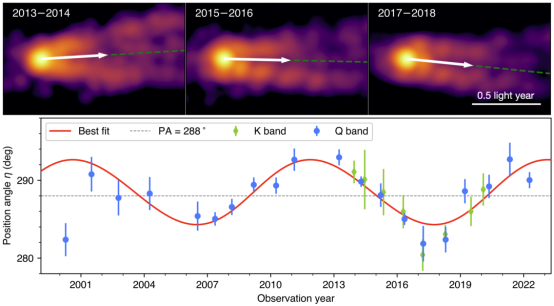 由来自全球45个研究机构的科研人员组成的国际科研团队通过分析多个甚长基线干涉测量(Very Long Baseline Interferometry,VLBI)网在2000年至2022年的观测数据,发现M87星系中心黑洞喷流呈现周期性摆动,摆动周期约为11年,振幅约为10度。