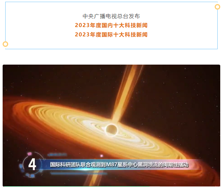 近日,“国际科研团队联合观测到M87星系中心黑洞喷流的周期性摆动”成果入选中央广播电视总台发布的2023年度“国际十大科技新闻”。