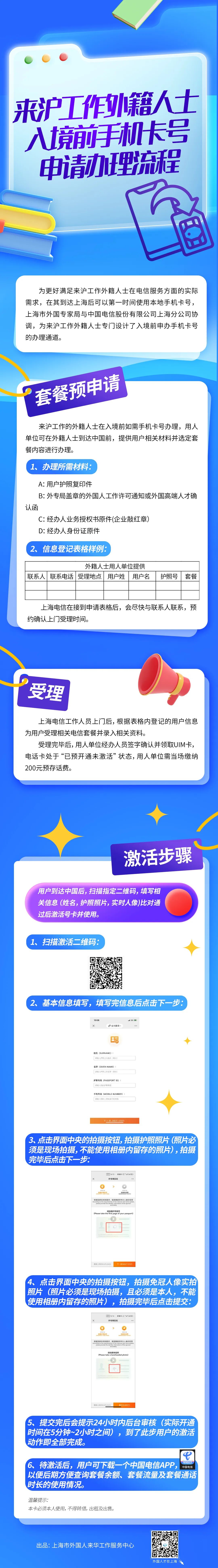 为更好满足来沪工作外籍人士在电信服务方面的实际需求,在其到达上海后可以第一时间使用本地手机卡号,上海市外国专家局与中国电信股份有限公司上海分公司(以下简称“上海电信”)协调,为来沪工作外籍人士专门设计了入境前申办手机卡号的办理通道。