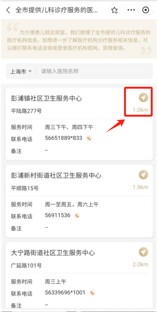 1、进入“随申办”(APP、微信小程序、支付宝小程序),首页选择“儿科服务查询”,页面默认显示附近医疗机构信息。