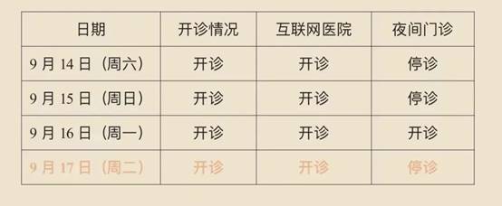 9月17日(周二)普通门诊停诊一天,9月18日起普通门诊照常运行。