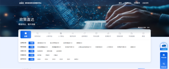 打开“浦易达”官网界面,点击“政策直达”,就会出现“投资促进”“小微双创”“人才就业”“融资担保”等不同类别的政策标签。在政策列表一栏中,每个政策申报截止时间、发布时间、资金额度等信息一目了然,企业用户可以快速获取申报政策所需的信息。