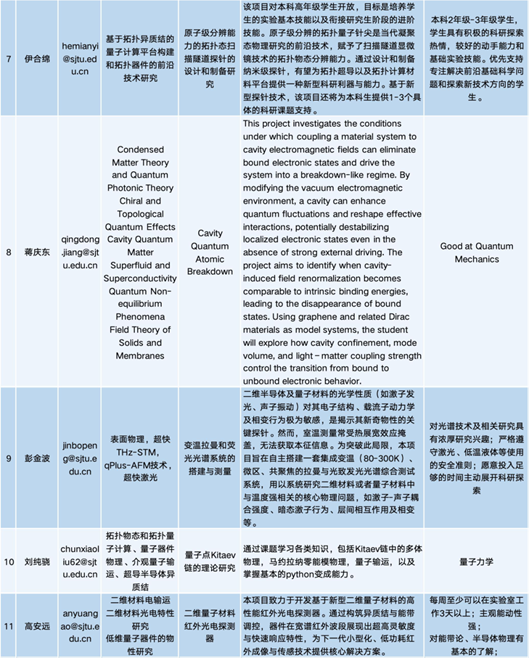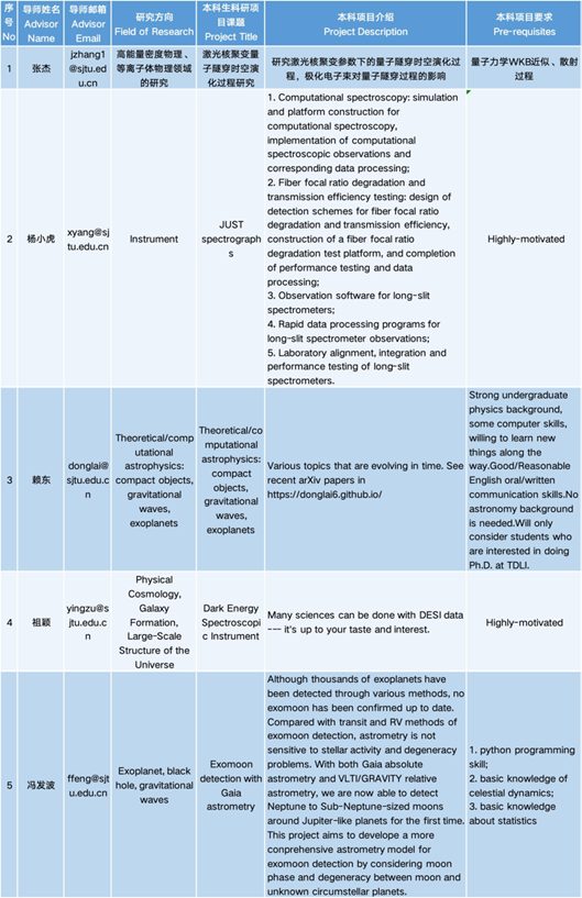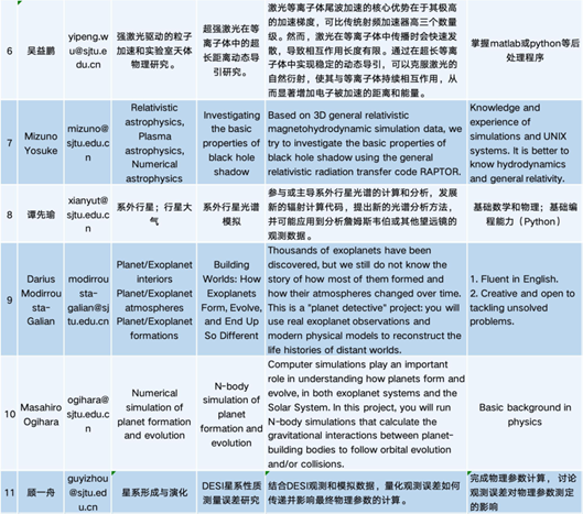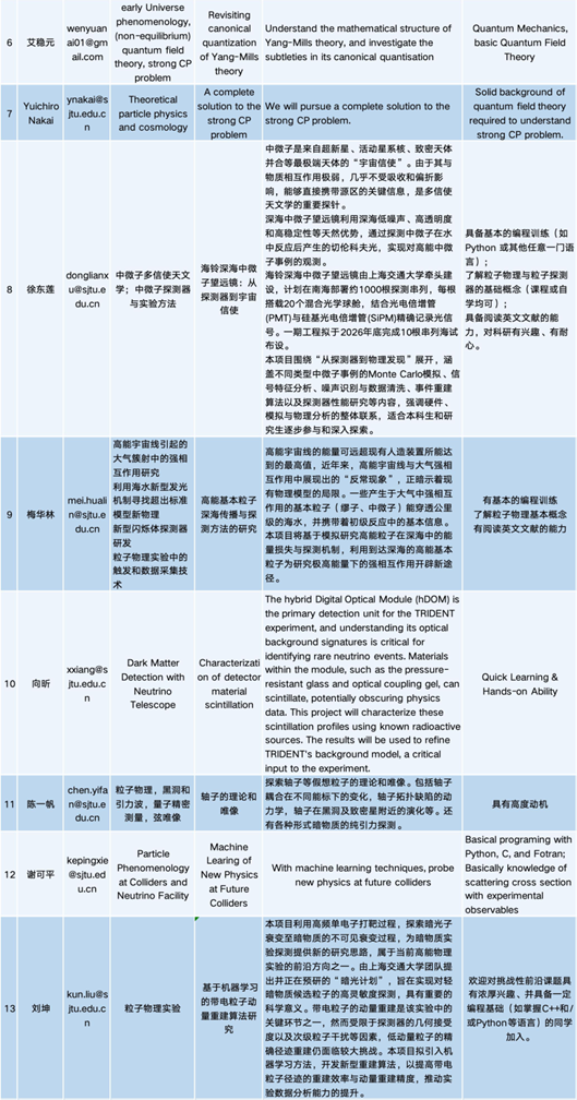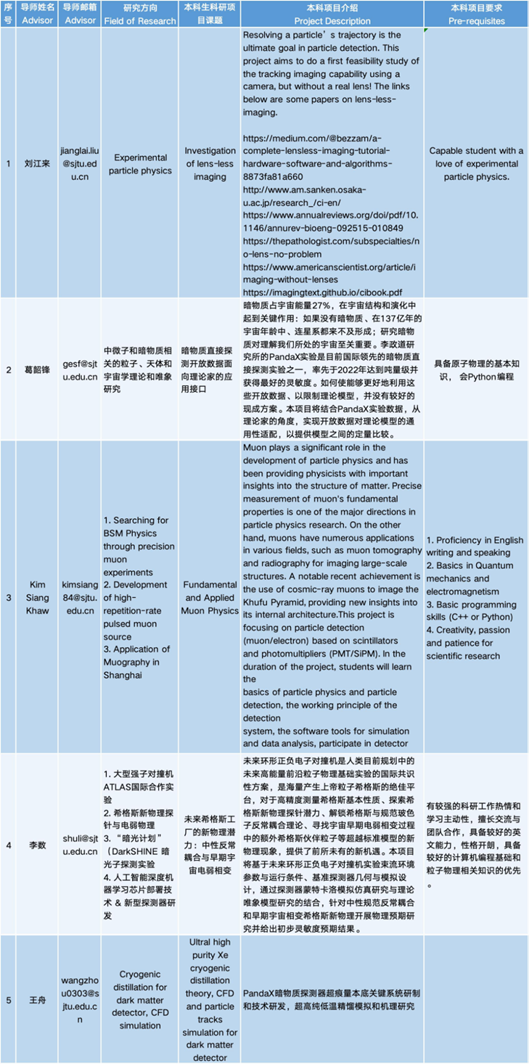 课题涉及暗物质探测、缪子物理、拓扑物态、量子材料、系外行星形成、黑洞阴影模拟等前沿领域,形式包括理论分析、数值模拟、探测器研发、光谱系统搭建等,适合不同学科背景的学生参与。所有课题均提供导师一对一指导。部分课题对申请者有量子力学、编程等能力要求,建议申请前与意向导师充分沟通。项目具体起止时间可与导师协商后确定。