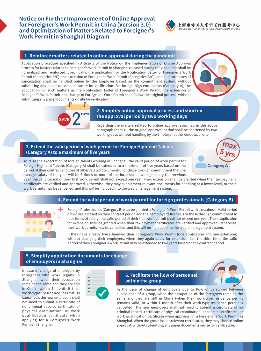 为贯彻落实市委市政府《关于新时代上海实施人才引领发展战略的若干意见》精神,进一步优化本市营商环境,提升外国人来华工作窗口的服务质量,上海市科学技术委员会(上海市外国专家局)结合疫情期间推出的一系列举措,不断完善外国人来华工作许可“不见面”审批,最新3.0版来啦!推出“一固二增三减”6条举措,为用人单位和外国人才办理外国人来华工作许可提供更多便利!
